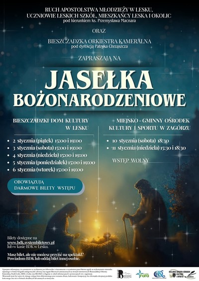 Jasełka Bożonarodzeniowe w wykonaniu Ruchu Apostolstwa Młodzieży w Lesku, uczniów leskich szkół, mieszkańców Leska i okolic pod kierunkiem ks. Przemysława Macnara oraz Bieszczadzkiej Orkiestry Kameralnej pod dyrekcją Patryka Chrząszcza.
